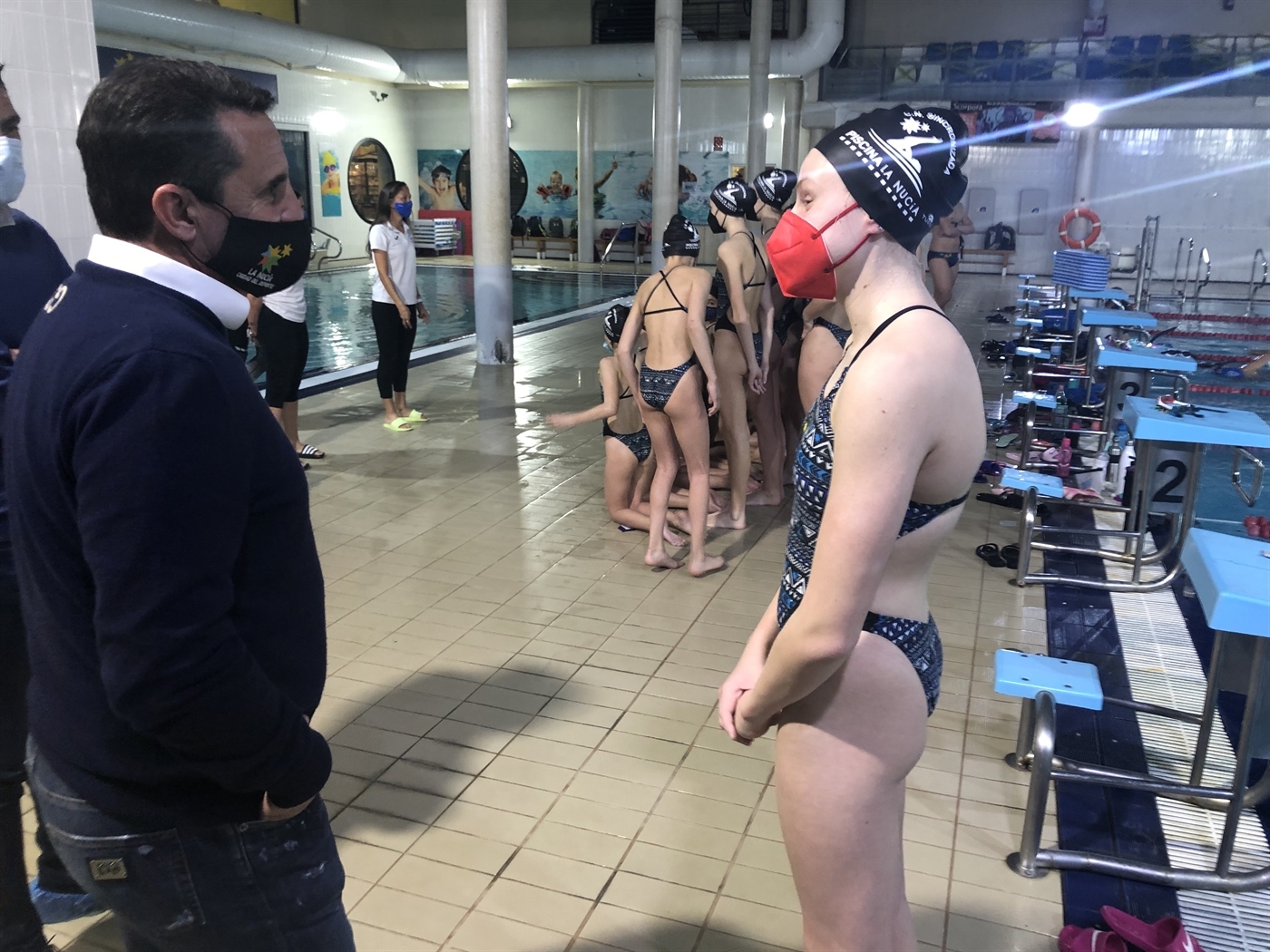La gran actuación del Club de Natación Sincronizada en el pasado Campeonato de España Alevín e Infantil hizo que las nadadoras fueron felicitadas personalmente por Bernabé Cano, alcalde de La Nucía y Sergio Villalba, concejal de Deportes, en la Piscina Climatizada Camilo Cano, durante sus entrenamientos.