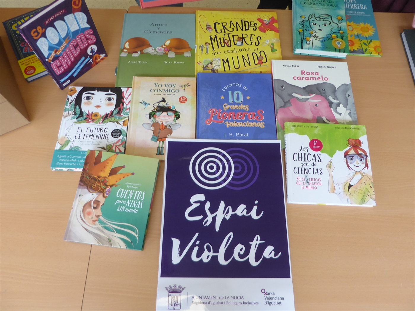 Los Espais Violetes instalados en la Biblioteca Municipal, las Bibliotecas de los colegios públicos La Muixara y Sant Rafael así como en la biblioteca del IES La Nucía recogen una selección de obras de reciente publicación así como clásicos de la literatura feminista adaptados al público de cada uno de los centros.