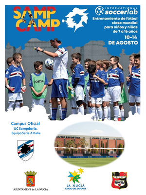 El primer Campus de la Sampodria “Samp Camp” en España se desarrollará del 10 al 14 de agosto en la Ciutat Esportiva Camilo Cano de La Nucía. Durante estos 5 días se realizarán 6 horas de entrenamiento en dos sesiones diarias, con almuerzo a mediodía para recobrar fuerzas, incluido en el precio. Al finalizar el Campus l@s futbolistas que han participado recibirán su diploma de la Sampdoria.