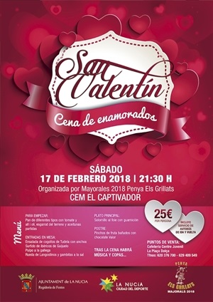 Esta “Cena de Enamorados. San Valentín 2018” está abierta tanto a festeros como no festeros. El precio de la cena es de 25 € e incluye tanto el menú, como el desplazamiento en autobús desde La Nucía hasta el CEM Captivador. Los puntos de venta son en la Cafetería del Centre Juvenil y en la Plaça Dolça y el plazo de reservas finaliza el próximo viernes a mediodía.