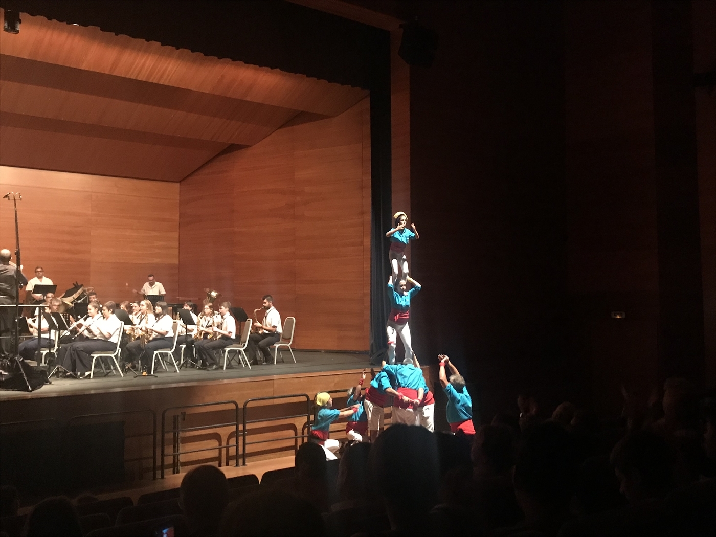 La sorpresa del concierto llegó en la sexta pieza “Muixerangues al Cel” de Juan Carlos Sempere. Con los primeros acordes de este tema empezaron a bajar los miembros de la colla “Muixeranga Marina Baixa” por los pasillos del patio de butacas de l’Auditori de la Mediterrània, “entrada amb pinets de 2 altures” en un perfecto equilibrio.