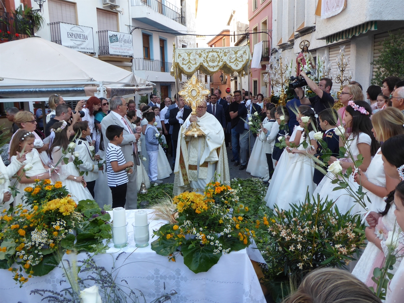 Ayer domingo 3 de junio por la tarde se celebró la tradicional Procesión del Corpus Cristi de La Nucía. Las flores, plantas y mantones florales decoraron las calles de La Nucía por las que pasó la procesión. Acto religioso en el que participaron los niños y niñas que han tomado la comunión este año, así como la banda de la Unió Musical La Nucía.