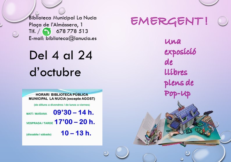 La Exposición de Libros Pop-Up “Emergent!” es  propiedad de la Biblioteca de Onda (Castellón) y está organizada por la Biblioteca Municipal de La Nucía y la concejalía de Cultura del Ayuntamiento de La Nucía. Se trata de una muestra formada por un total de 66 libros y unos carteles explicativos de las distintas técnicas desplegables, entre las que encontramos libros de serpentina, emergentes, acuñados, musicales, de construcción, de lengüetas, ruedas y solapes, desplegables, metamorfosis, carrusel y panorama.