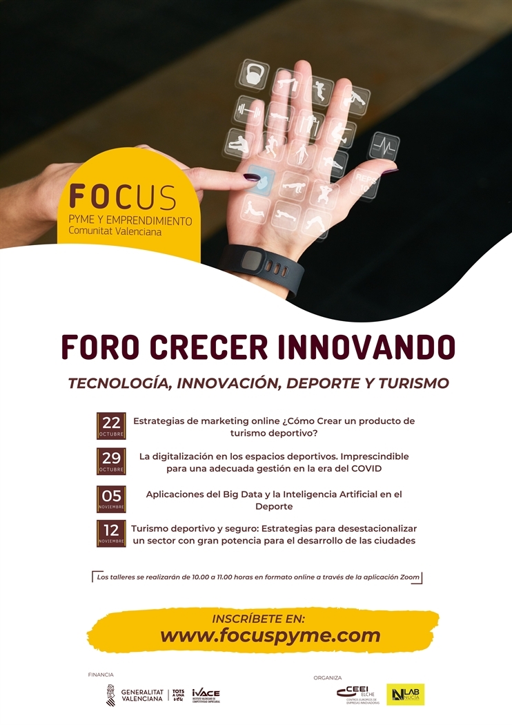 La Tecnología, Innovación, Deporte y Turismo son palancas para el desarrollo de las ciudades, y en este foro, se hará hincapié en estos cuatro ejes, teniendo en cuenta el nuevo escenario socioeconómico al que nos enfrentamos. El “Foro Crecer Innovando Lab_ Nucia 20” está organizado por el Centro Europeo de Empresas Innovadoras de Elche (CEEI Elche), Ayuntamiento de La Nucía a través del Lab_Nucia y financiado por el Instituto Valenciano de Competitividad Empresarial (IVACE), dentro de su política de apoyo al emprendimiento innovador. También colaboran Instituto de Biomecánica de Valencia, SUMERU, ESPORTTER, Esatur y Distrito Digital Comunitat Valenciana. Foro que se enmarca dentro del proyecto “Focus PYME y Emprendimiento Comunitat Valenciana".