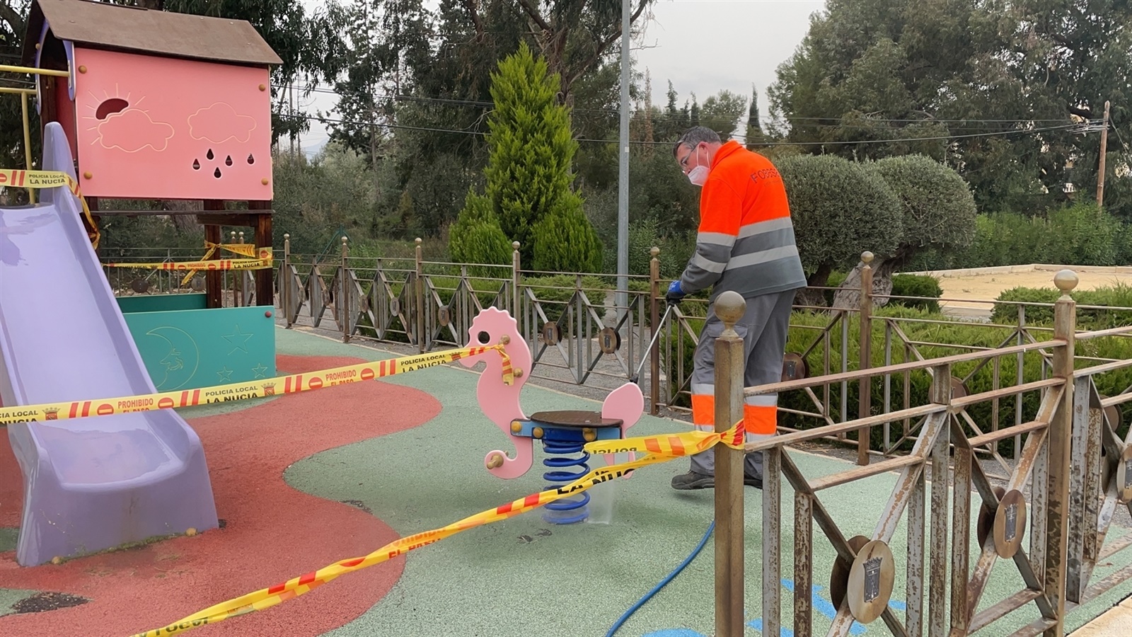Previamente a su apertura se ha intensificado la desinfección de estas “zonas infantiles” de los parque de La Nucía, con agua a presión con hipoclorito y otras sustancias desinfectantes. Para intentar que estén listos para su reapertura.