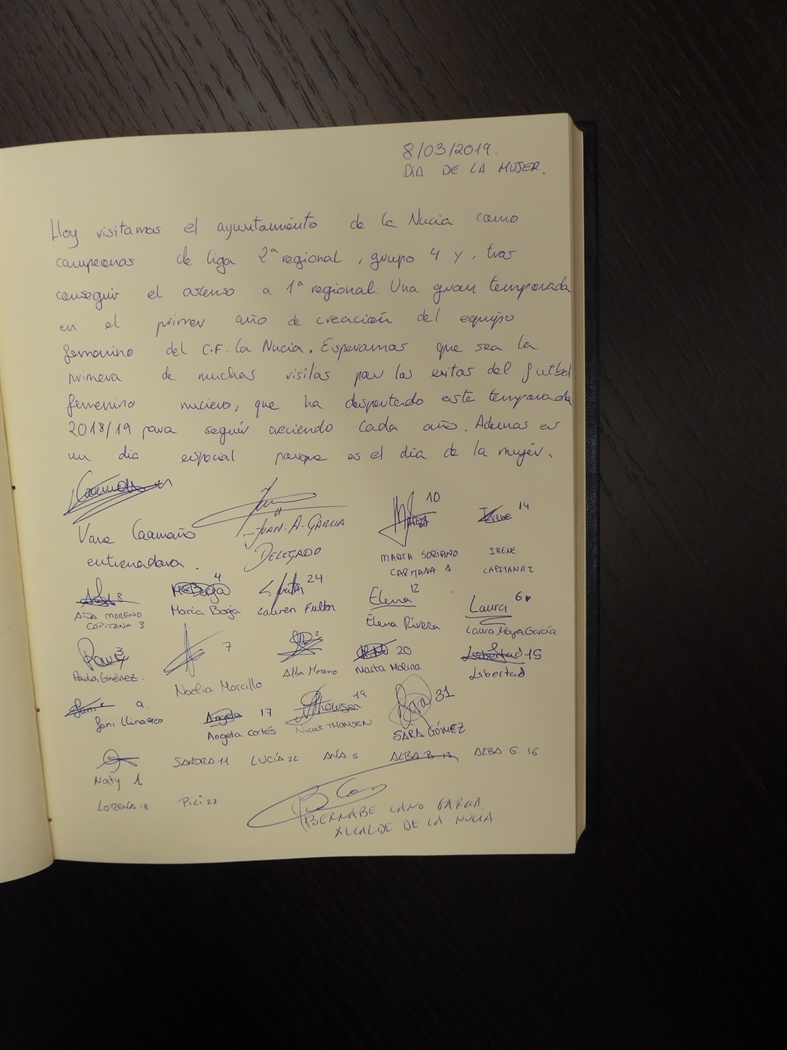 Tras conversar con Bernabé Cano, alcalde de La Nucía y Sergio Villalba, concejal de Deportes, y explicar su título liguero, las 23 jugadoras y el cuerpo técnico firmaron en el “Libro de Honor del Ayuntamiento de La Nucía”, donde relataron el motivo de sus visita y el histórico ascenso a “Primera Regional” de un equipo femenino nuciero. En su escrito el femenino del CF La Nucía relató que “espera volver pronto con nuevos éxitos y ascensos”.