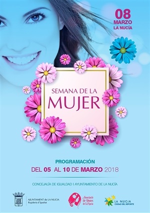La concejalía de Igualdad de La Nucía ha programado un completo programa de actos para la Semana de la Mujer 2018, que se celebrará del 5 al 11 de marzo. VIII Concurso de Poesía, Charlas “Consigue tus sueños” y “Tu Felicidad te pertenece”, Taller de Sevillanas, Zumba, Defensa personal, Espalda Sana, Aquagym y la participación activa en el XVIII Encuentro de Mujeres de la Marina Baixa son las principales actividades que se realizarán con motivo del “Día Internacional de la Mujer el 8 de marzo. Todas las actividades son gratuitas excepto el Encuentro de Mujeres de la Marina Baixa.