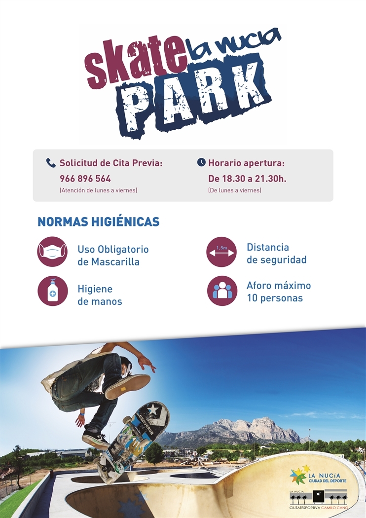 El horario del Skate Park será de lunes de lunes a viernes de 18:30 a 21:30 horas, sólo con cita previa, ya que el aforo máximo es de 10 personas. Los turnos serán de un máximo de 1 hora. Todas las personas interesadas en utilizar el Skate Park deberán solicitar cita previa a través del teléfono 9668965 64 (Pabellón Municipal). A la entrada de la instalación se ha instalado un panel sobre las medidas de protección que deben cumplir los usuarios de esta instalación deportiva como el uso obligatorio de mascarilla, higiene de manos , distancia de seguridad y un aforo máximo de 10 personas.