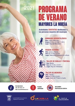 El programa de actividades de Verano de los Mayores de La Nucía contará con Talleres de Dibujo y Pintura, Taller de Memoria, Gimnasia Gerontológica y Paseos Activos. Todas las actividades son gratuitas y contarán con protocolo COVID. Las plazas son limitadas y las inscripciones se deben realizar a través del teléfono del Centro 3ª Edad La Casilla (965 082 179) o en el email: lacasilla@lanucia.es