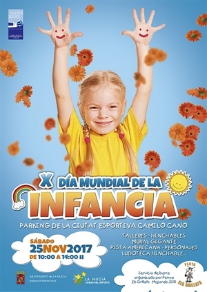La Concejalía de Bienestar Social de La Nucía conmemora el X Día Internacional de la Infancia mañana sábado 25 de noviembre por la mañana en la Ciutat Esportiva Camilo Cano. Esta actividad totalmente gratuita está enfocada a escolares de 3 a 12 años, para que disfruten de una jornada lúdica y convivencia. En su décima edición el Día de la Infancia de La Nucía contará con más de 20 actividades gratuitas y como novedad habrá un gran mural sobre los Derechos de la Infancia, donde cada niño o niña podrá hacer su aportación.