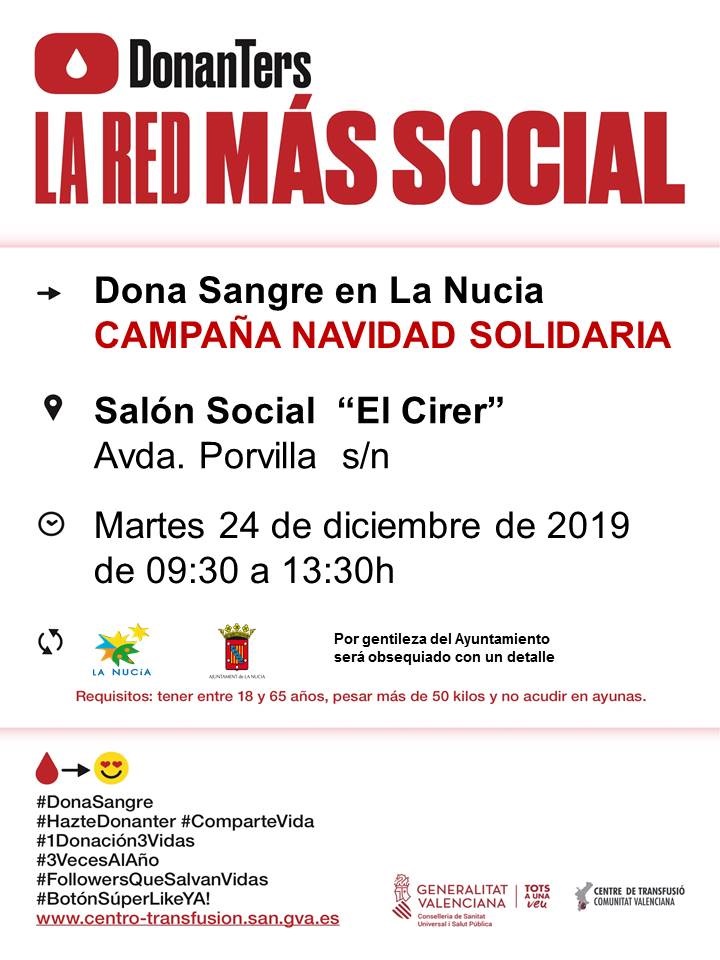 Desde el Ayuntamiento de La Nucía se hace un llamamiento para la donación de nuevos donantes en esta captación del mes de diciembre, “ya que la sangre escasea en los hospitales y la sangre no se puede fabricar. La única forma de obtener sangre es mediante la donación solidaria de los ciudadanos y ciudadanas”. La participación en La Nucía ha aumentado considerablemente en las últimas captaciones con una media de 30 donaciones mensuales en este 2019. Pero toda ayuda es poca ya que se necesitan diariamente en la provincia de Alicante 300 donaciones, que es lo que utilizan globalmente cada jornada los hospitales de nuestra provincia.