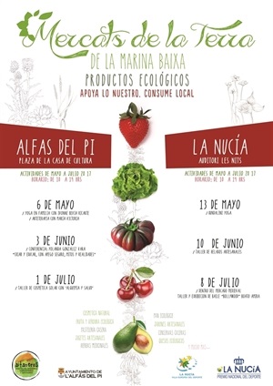 El Mercat de la Terra de La Nucía está organizado por la Asociación de Pequeños Agricultores y Artesanos de la Marina Baixa en colaboración con el Ayuntamiento de La Nucía. El objetivo de este Mercat mensual es recuperar el sector productivo de la comarca de la Marina Baixa, dinamizando la economía local, a través del cultivo agroecológico, la transformación de alimentos a pequeña escala y la artesanía. En este Mercat se pueden encontrar productos agroecológicos, productos de temporada, variedades agrícolas locales, cosmética natural, miel, repostería, artesanía, etc.