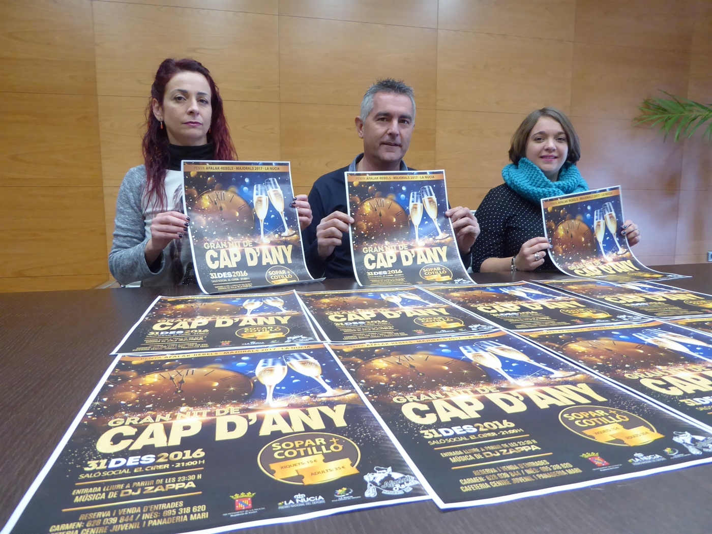 Els Majorals 2017 Penya Afalak- Rebels  y la concejalía de Fiestas del Ayuntamiento de La Nucía han organizado una Fiesta-Cena de Nochevieja en el Salón Social El Cirer el sábado 31 de diciembre de 2016 a partir de las 21:00 horas. La Fiesta contará con cotillón y música (DJ Zappa) y las reservas se pueden realizar en Cafetería Centre Juvenil y Panadería Mari. También habrá un menú infantil para niños por 15 euros.