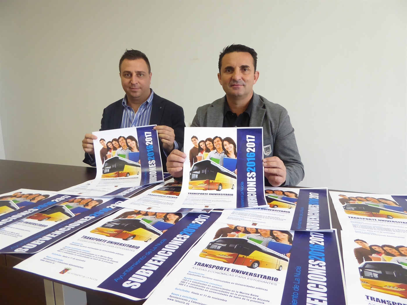 115 universitarios nucieros se beneficiarán este curso 2016-2017 de la Subvención del Transporte Universitario, convocada por el Ayuntamiento de La Nucía. El consistorio nuciero destina un total de 40.000 € a esta subvención al Transporte Universitario. Esta ayuda económica está destinada a los estudiantes nucieros,  matriculados en universidades públicas.