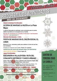 11 dic.2019 Cuenta Cuentos y Feria de Navidad en el programa de 3ª Edad de diciembre La concejalía de la Tercera Edad y la Asociación de Jubilados y Pensionistas de La Nucía han programado varias actividades para el mes de diciembre: Fiesta de la Navidad en el Salón Social El Cirer, Cuenta Cuentos Intergeneracional de Navidad, IX Feria de Navidad de La Nucía y Excursión a Villajoyosa.