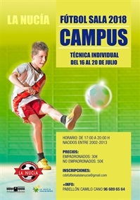 05 jul.2018 Últimas plazas para el XVI Campus de Fútbol Sala de La Nucía La Ciutat Esportiva Camilo Cano albergará el XVI Campus de Fútbol Sala de La Nucía del 16 al 20 de julio. Este Campus está dirigido a niños de entre 6 y 12 años