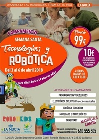 29 mar.2018 Últimas plazas para el "Campamento de Robótica de Pascua" Del 3 al 6 de abril en la Ciutat Esportiva Camilo Cano se desarrollará un Campamento de Semana Santa de "Tecnologías y Robótica" enfocado a escolares de 6 a 14 años de edad.