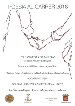 El jueves 9 de agosto a las 22 horas en el carrer Major de La Nucía se celebrará el “XIX Encontre de Poesia al Carrer” organizado un año más por Lanuza Edicions y la penya la Bota con la colaboración de la concejalía de Cultura del Ayuntamiento de La Nucía y els Majorals 2018 Els Grillats. Esta décimo novena edición contará con la presentación de la novela “Els viatges de Mireia” de Jesús Navarro Rodríguez. Al finalizar las presentaciones habrá un turno de poesía libre por parte del público como en las anteriores ediciones hasta medianoche.