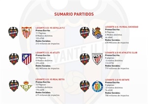 Los datos de los impactos generados en la red social Twitter y en Instagram han permitido conocer la repercusión de cada partido, a través de un hashtag principal, el del Levante y cada uno de los seis clubs contra los que jugó en el Estadi Olímpic Camilo Cano: #LevanteSevillaFC, #LevanteAtleti, #LevanteRealBetis, #LevanteRealSociedad, #LevanteAthletic, #LevanteGetafe, así como de varios relacionados con cada uno de esos encuentros.