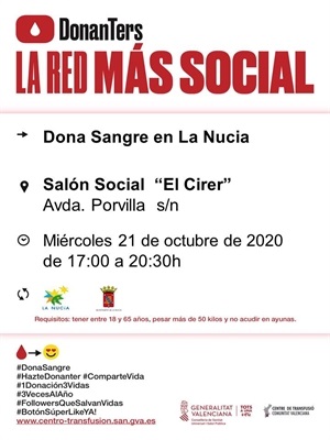 Desde la concejalía de Sanidad se recuerda que “no hay acto más solidario que donar sangre y más durante esta crisis sanitaria de la COVID-19”. Todos l@s interesad@s en participar en esta jornada de donación de sangre deben dirigirse el próximo miércoles 21 de octubre de 17 a 20,30 horas al Salón Social “El Cirer” de La Nucía. Para donar sangre no es necesario preinscribirse, ni tener carnet de donante.