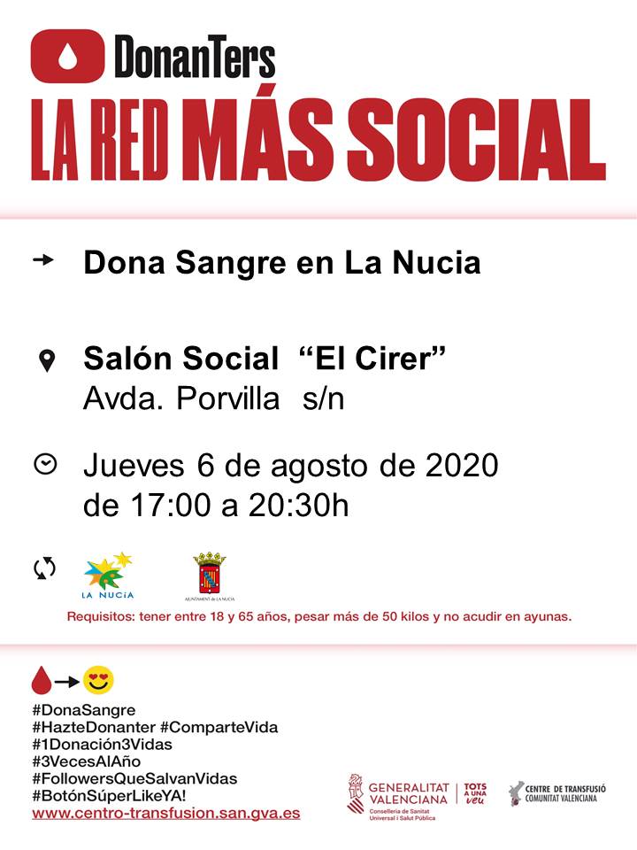 Este jueves 6 de agosto de 17 a 20,30 horas se realizará una donación de sangre en el Salón Social El Cirer. El Centro de Transfusión de la Comunidad Valenciana se desplaza a La Nucía para realizar la décima captación de 2020. Una donación donde se guardarán todos los protocolos de protección y seguridad por la COVID-19. Donar sangre es más necesario que nunca por ello desde la concejalía se anima a participar en la donación, bajo el lema “Dona Sangre y Salva 3 vidas”.
